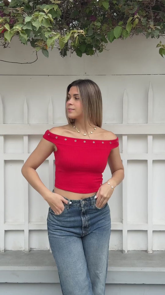 - Escote off-shoulder con ojalillos metálicos // Off-shoulder neckline with metal eyelets